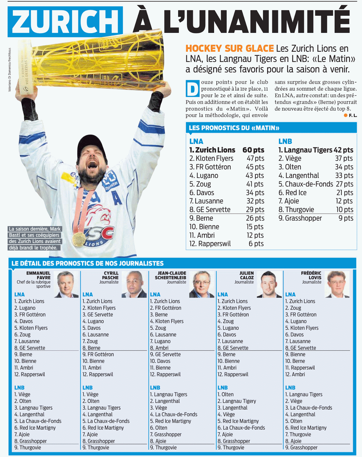 Dans le même article! Faut savoir!! En l'occurrence il me semble que c'est 6 sur 7, mais bon...Ils anticipent?Dans la TdG du jour... a écrit :Mais comment donc s’y prendre pour dompter ce Lion qui prend un malin plaisir à mordre l’Aigle depuis qu’il a opéré son retour en LNA (sept succès en huit rencontres depuis la saison dernière)? (...) Depuis leur retour en LNA, les Vaudois restent sur six victoires en sept matches face aux Aigles