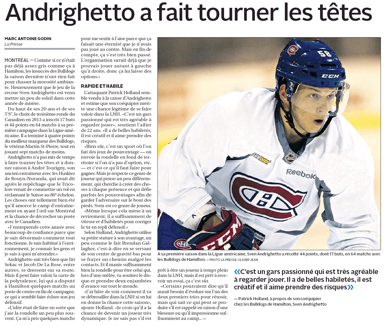 Andrighetto est classé parmi les meilleurs espoirs en attaque de Montreal, je le vois mal revenir (même après une saison en AHL) alors qu'il est si proche du but...